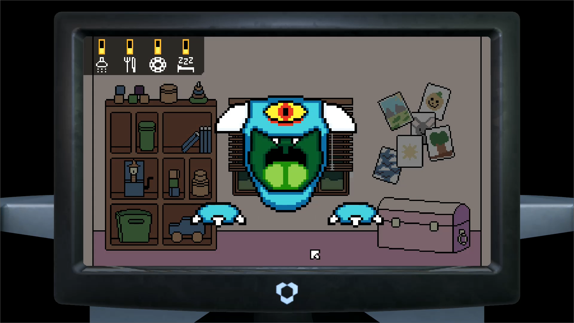 What first appears to be a cute virtual pet quickly turns sinister. Whenever it’s displeased, the creature slips out of the screen and melts into the shadows of the warehouse. The game flips: now you’re the one being toyed with.